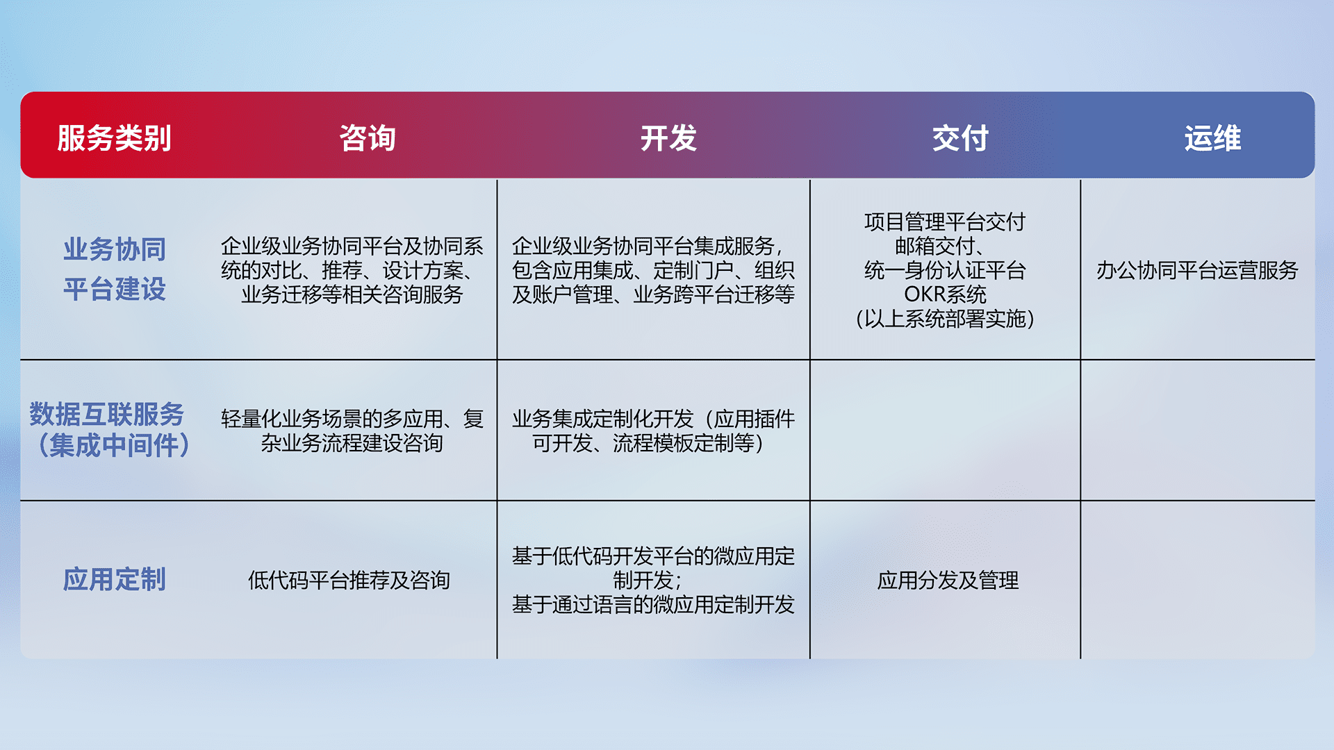 针对钉钉、、、企微、、IDaas等平台级产品提供产品的规划、、方案、、、、交付、、、定制化开发等服务,,,实现如统一协同办公、、、智能客户服务、、、、混合会议管理、、、智能数据查询、、等业务场景,,实现数字化转型。。。。