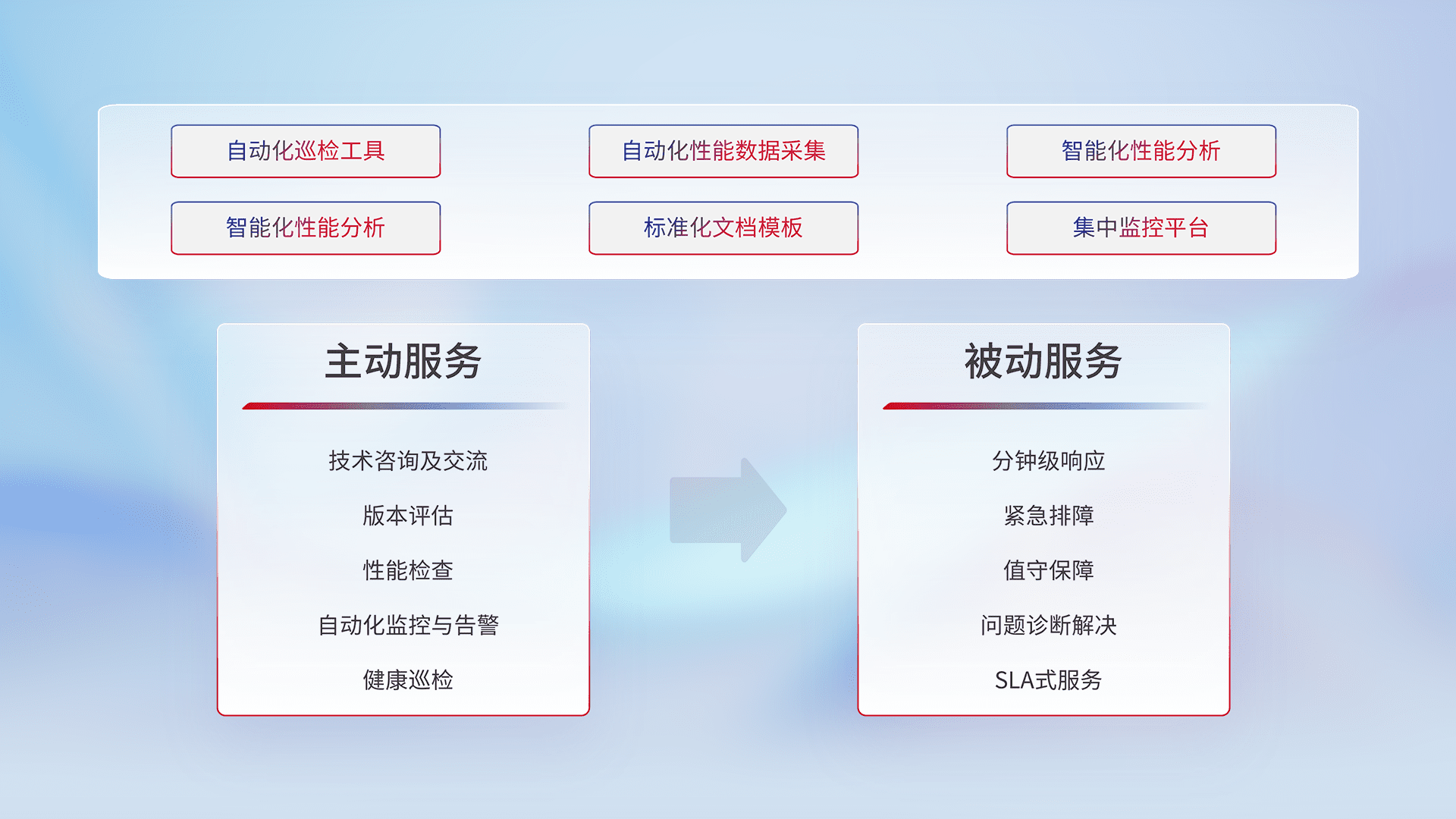 智能化工具和标准化文档,,,保障服务质量,,,提供主动服务(包含技术咨询、、、、版本评估、、、性能检查、、、自动化监控与告警、、、健康巡检)和被动服务包含(分钟级响应、、、、紧急排障、、、值守保障、、、、问题诊断解决、、、、SLA服务)。。